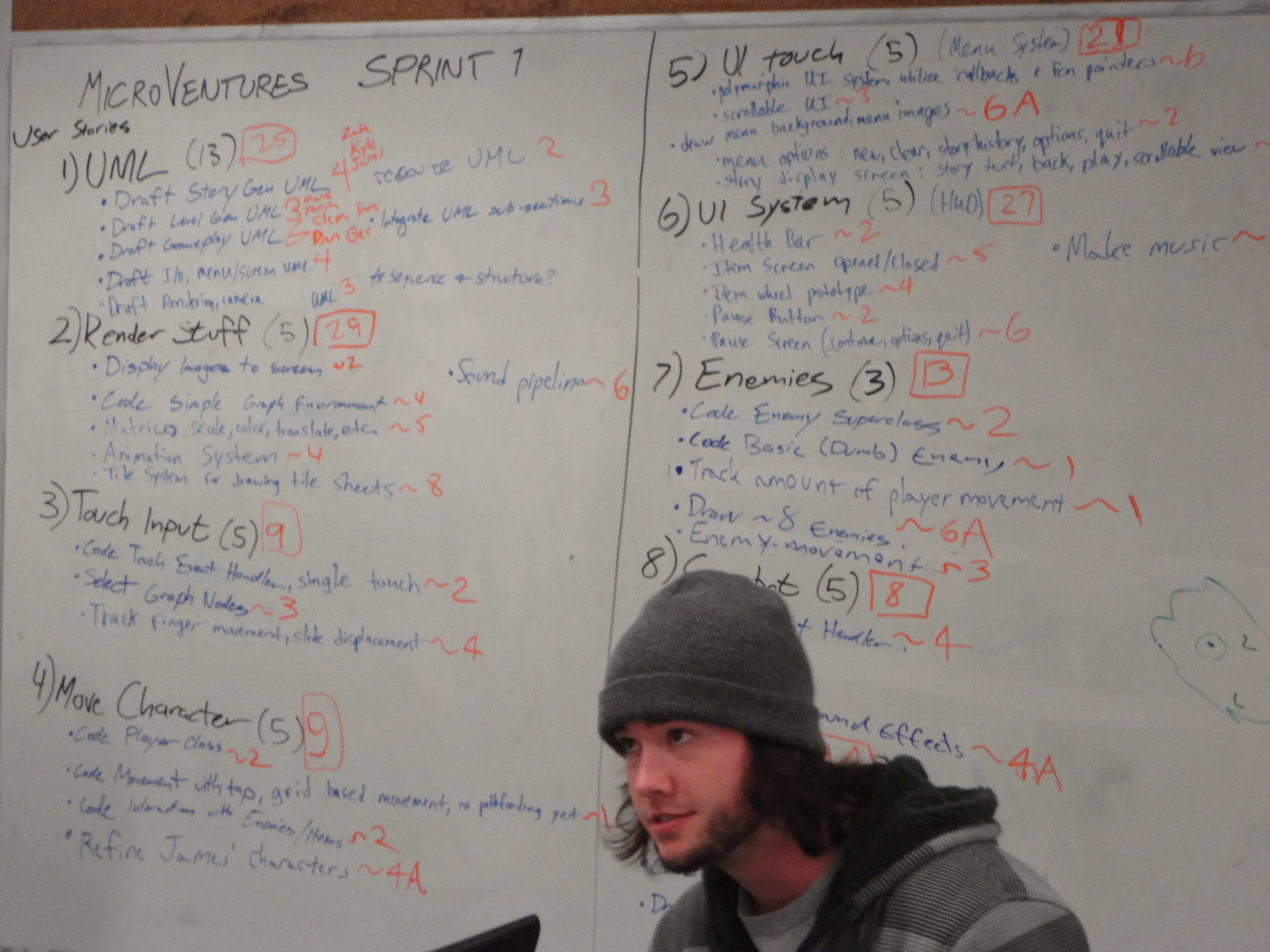 Opened up the week with some class diagrams, but it quickly turned into Jamestown Sunday. What was suppose to be a short gaming session before we parted ways turned into a three hour ordeal. But by the end of it we beat the level and that’s one more task off the SCRUM board for Microventures!